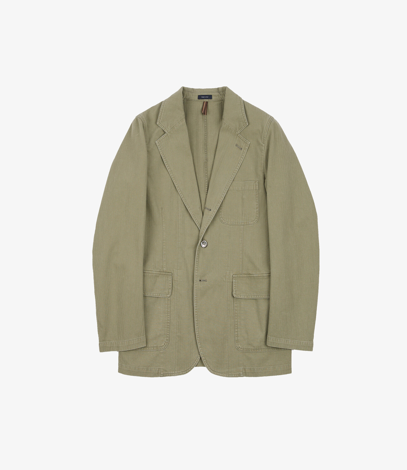 The fabric is an 8.8oz herringbone twill woven in Japan, inspired by 1940s US military cloth. It offers a distinctive texture with a balance of structure and comfort, suitable for year-round use. The blazer can be worn on its own or paired with matching trousers for a relaxed take on a classic two-piece.