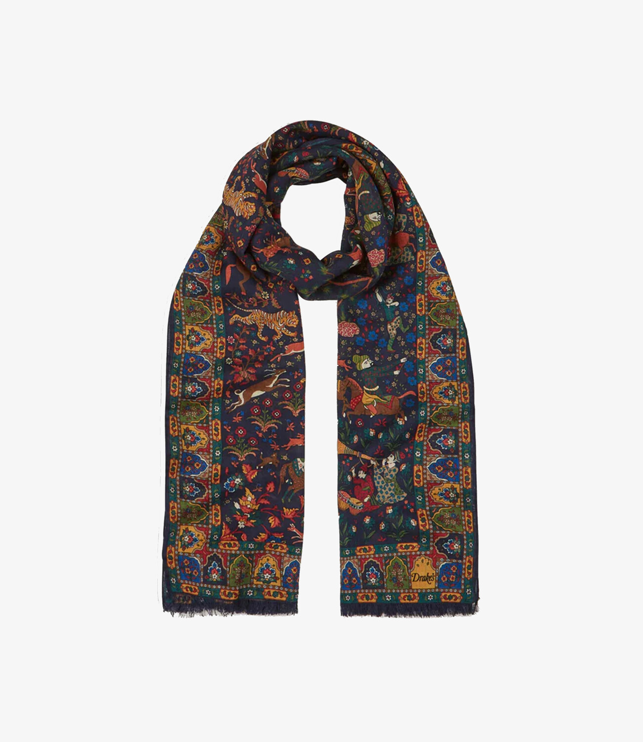 Drake's first introduced printed scarves in the late 1970s, and they’ve remained a cornerstone of the brand ever since. This particular scarf showcases a striking motif from Drake's extensive design archive— iconic Mughal hunter print. Expertly crafted in Italy, the vivid design is applied to a luxurious blend of 70% wool and 30% silk, offering both warmth and a refined drape.