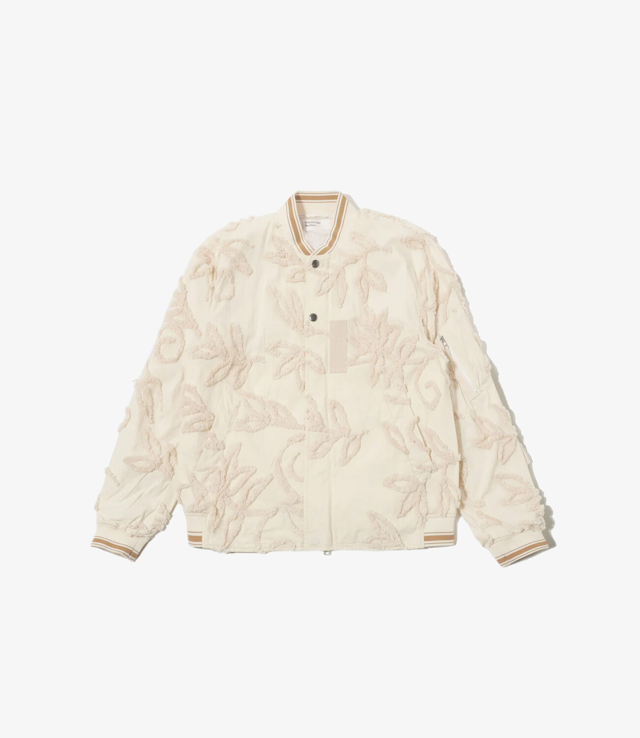Functional elements are central to the design. Large hand warmer pockets offer practicality, while a zipped utility stash pocket on the sleeve references traditional military flight jackets. An internal buttoned pocket adds further utility without compromising the clean exterior.