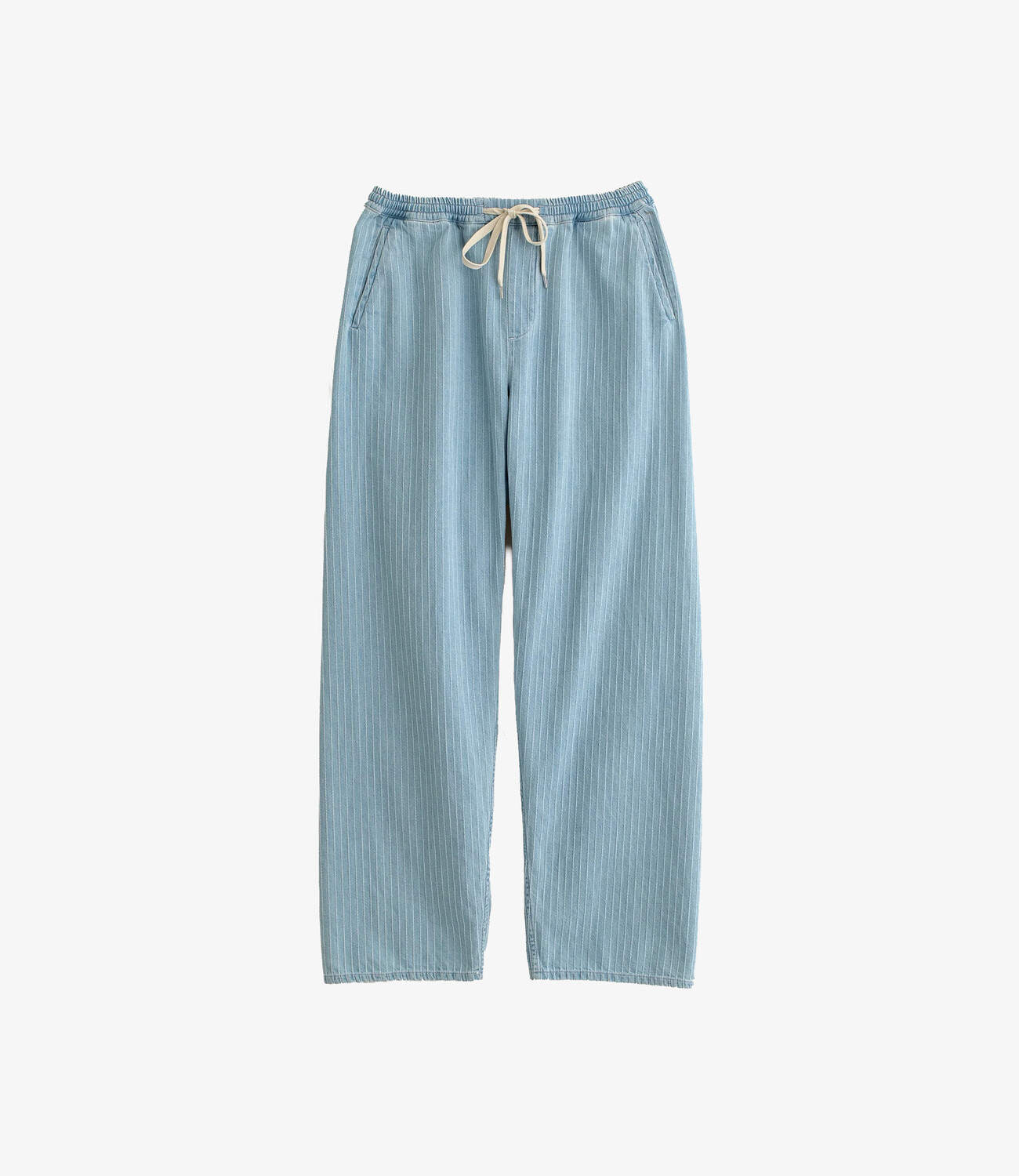 The fabric is a mid-weight denim woven in Italy from 100% organic cotton. The light blue base is enriched with subtle white pinstripes, while the medium pure indigo wash adds depth and character. The washed finish softens the fabric and enhances its natural drape, resulting in a refined yet relaxed feel.